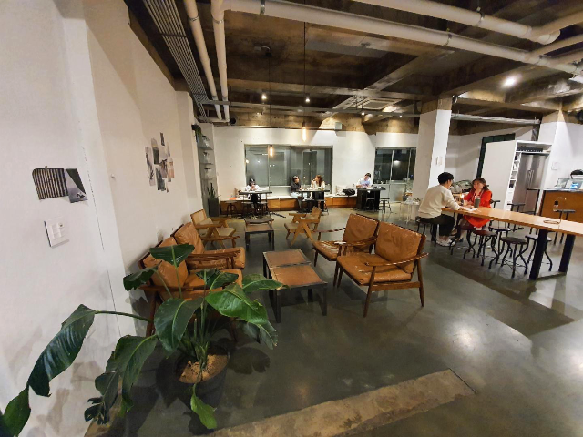 넓은 구조의 카페를 다양한 테이블과 의자로 연출하여 지루하지도 너무 튀지도 않는 모던한 분위기의 느낌을 주었습니다. 홍대 어느 곳의 카페 같았습니다.