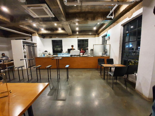 레트로 느낌의 노출 천장 인테리어지만 강한 조명으로 카페 분위기가 밝아 보입니다.