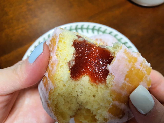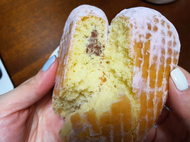 아내 분과 나눠먹기 위해 반으로 갈라보았습니다. 잼잼인데 잼은 하나도 보이지 않았습니다. 아내와 저는 잘못 만들어진건가 하는 생각이 들었습니다.