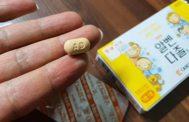 약국에서 받아온 약은 알벤다졸입니다. 온 가족이 함께하는 종합구충제로 귀여운 가족과 귀여운 반려동물까지 그림이 그려져 있습니다. 약사 선생님께서 말씀하시길 한알을 먼저 먹고 1주일 뒤에 나머지 한알을 먹으라고 말씀하셨습니다.
