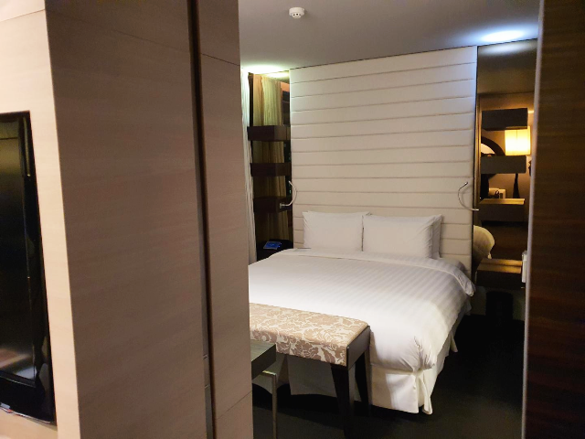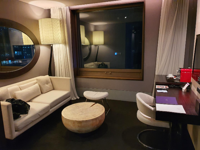 침대 옆 창문은 거실과 같은 시티뷰입니다. 침실이 불편했던 점은 침대 사이드로 핸드폰 충전할 수 있는 전원코드가 없었습니다. 핸드폰이 오래돼서 배터리도 약한데 충전하기가 쉽지 않아 불편하였습니다.