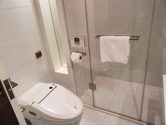 자동 비데가 있는 변기와 샤워부스입니다. 샤워부스가 넓어서 벽에 부딪히지 않고 좋았습니다.