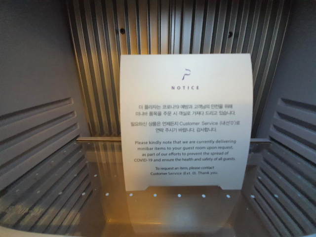작은 메모가 있었는데 코로나19 예방과 고객님의 안전을 위해 미니바 품목을 주문 시 객실로 가져다 드리고 있다고 합니다.