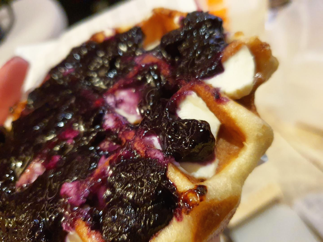 와플 블루베리 크림치즈입니다. 생활의달인에 나왔다고 합니다. 블루베리가 잼처럼 들어있습니다. 와플에서 떨어지지 않게 하려고 한 것 같습니다.
