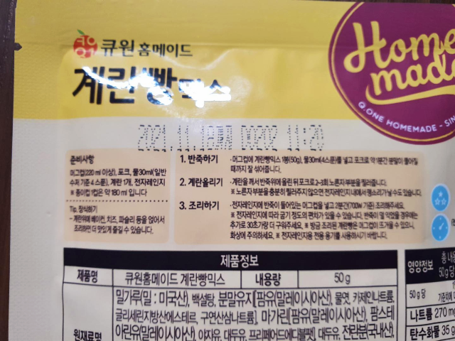 큐원 홈메이드 계란빵 믹스입니다. 마트에서 1,100원 정도 했던 것 같아요. 1인분으로 계란빵 1개 나오는데 1,100원이면 적당한 건지 모르겠습니다.