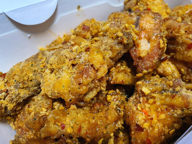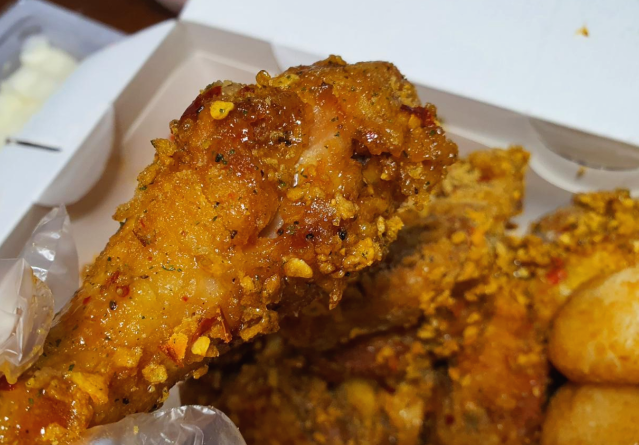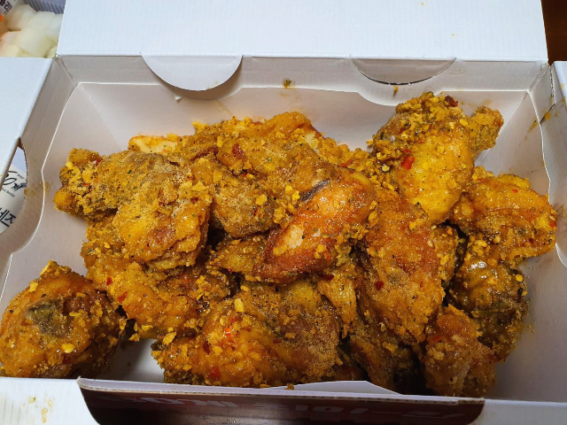 윤기가 좔좔 흐르고 갈릭파우더와 콘후레이크가 팍팍 묻어있습니다. 보기만해도 바삭함이 느껴지고 얼른 먹고 싶어지는 비주얼입니다.
