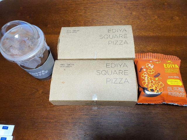 아이스카페모카(EX), 이디야스퀘어피자(베이컨포테이토피자) 2개를 주문하고 미니프레첼 볶음양념맛은 서비스로 받았습니다. 아내 분께서 제 피자도 잊지않고 주문해주셔서 감사했습니다.
