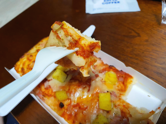 이디야 스퀘어 피자니깐 네모로 잘라먹어보았습니다. 생각보다 플라스틱 칼로 쉽게 잘라졌습니다.