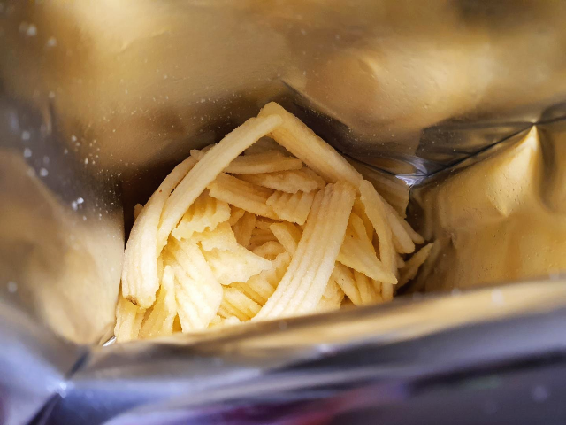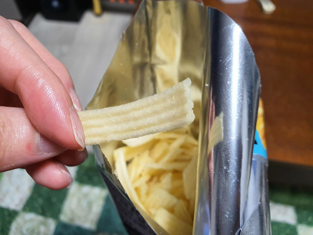 봉지를 뜯어보았습니다. 역시나 저 밑에 깔려있는 과자와 질소가 가득 들어있습니다. 버터향이 가득 퍼집니다. 감자 과자의 전형적인 둥글고 얇은 모양을 버리고 막대 모양에 물결까지 있습니다. 막대 모양을 하고 있어서 두께가 조금 있어보입니다.