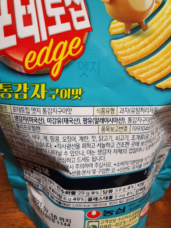 포테토칩 엣지는 통감자구이맛으로 생감자 90%, 통감자구이맛시즈닝 1.5% 함유되어 있습니다. 통감자구이는 맥주 안주로 자주 먹었었는데요. 포테토칩 엣지도 맥주 안주로 맛있을지 궁금해집니다.