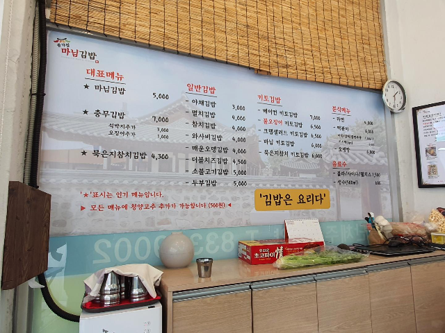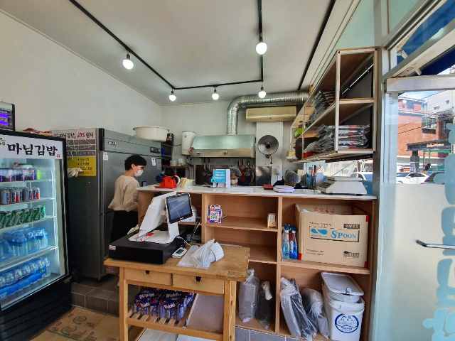 매장 내부는 좁은 편이고 취식할 수 있는 공간은 없었습니다. 한쪽으로는 어머니 두분이서 김밥을 만들고 계셨습니다. 포장 배달만 가능한 것 같았습니다.