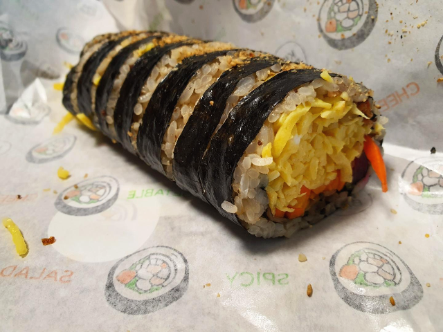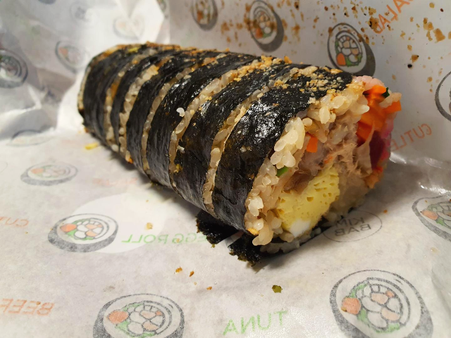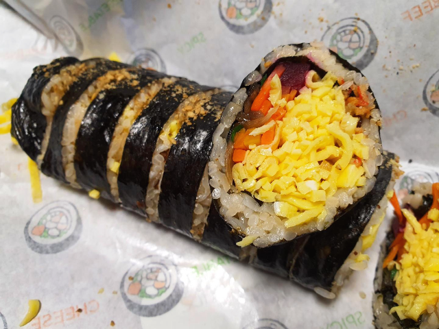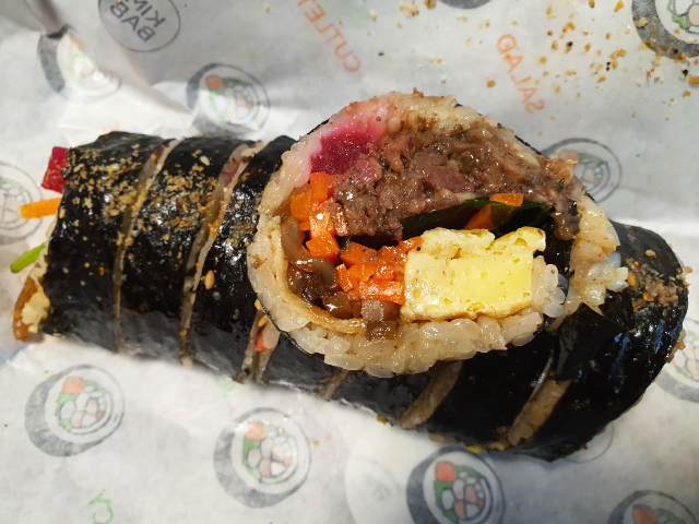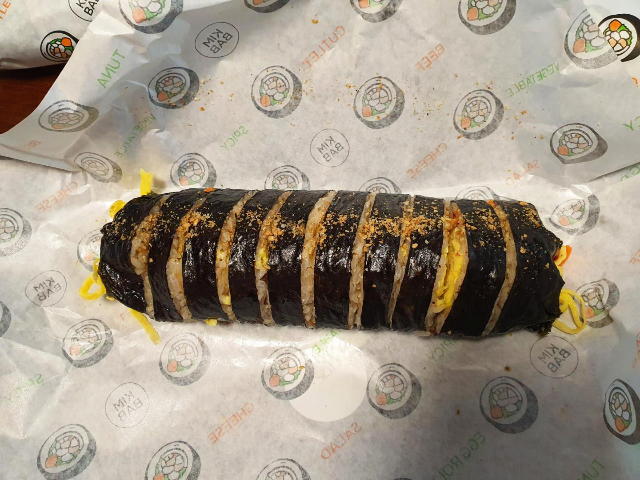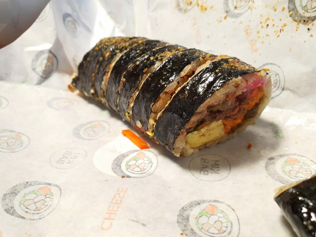 소불고기김밥입니다. 소불고기의 양념이 제대로 되어있어서 엄마가 해주는 소불고기에 밥을 먹는 느낌이었습니다. 김밥천국에서 먹던 소불고기는 고기가 말라비틀어진 느낌으로 그냥 고기 씹히는 맛이었다면 종가집마님김밥의 소불고기김밥은 소불고기가 제대로 요리된 고기로 김밥을 만든 느낌입니다. 소불고기의 질긴 부분이 조금 거슬리긴 했지만 감수할 만큼 충분히 맛있었습니다.