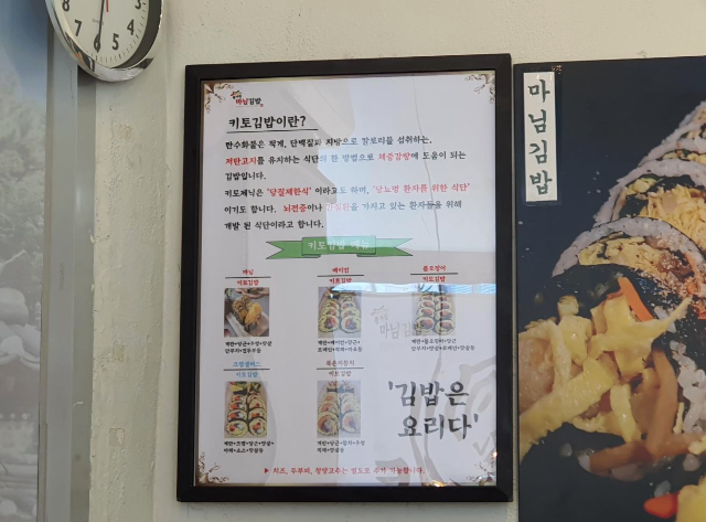 김밥치고는 가격이 상당합니다. 생소한 메뉴로 키토김밥이 있었는데요. 키토김밥이란 탄수화물은 작게 단백질과 지방으로 칼로리를 섭취하는 저탄고지를 유지하는 식단의 한 방법으로 체중감량에 도움이 되는 김밥이라고 합니다. 키토제닉은 당질제한식 이라고도 하며 당뇨병 환자를 위한 식단 이기도 합니다. 뇌전증이나 간질환을 가지고 있는 환자들을 위해 개발 된 식단이라고 합니다. 다음에 한번 먹어봐야겠습니다.