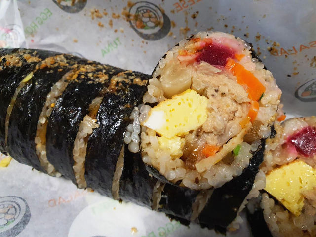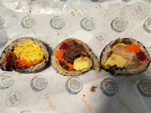 왼쪽부터 마님김밥, 소불고기김밥, 묵은지참치김밥 순입니다. 기본적으로 밥은 얇게 깔려있습니다. 노오란 계란이 시그니처처럼 들어가 있는데요. 노란 계란이 있어서 그런건지 단무지는 자색단무지를 사용하고 있었습니다. 밥도 그냥 하얀 밥이 아닌걸보니 여러가지로 신경을 많이 쓴 김밥이라고 느껴졌습니다.