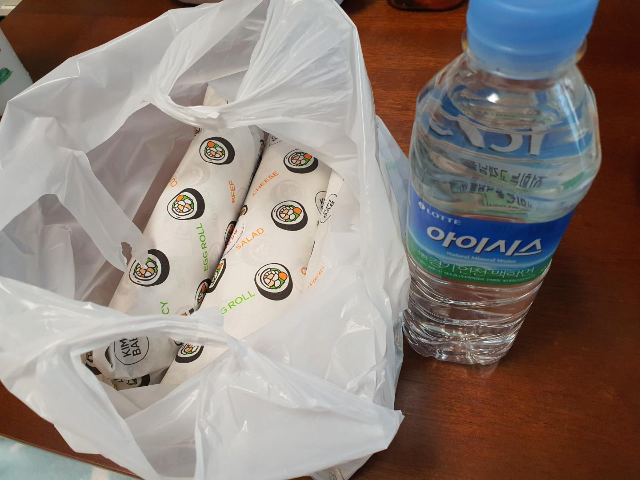 주문한 김밥을 집으로 데려왔습니다. 방문포장하는 사람에게 한시적으로 시원한 생수를 제공하고 있다고 합니다. 날씨가 더워지는 때에 아주 좋은 서비스 물이 될 것 같습니다.
