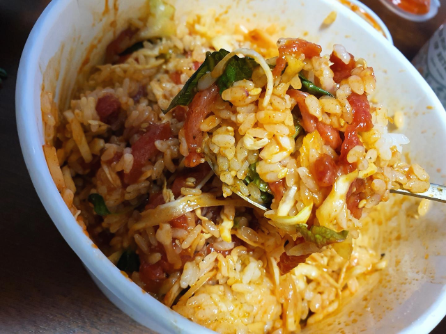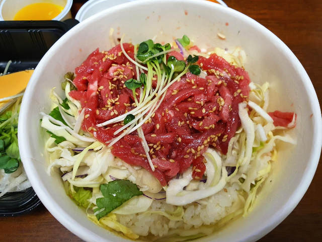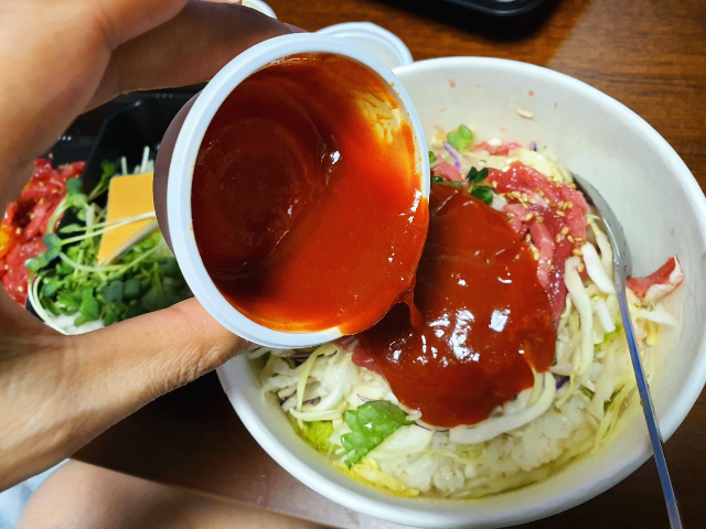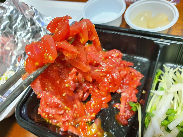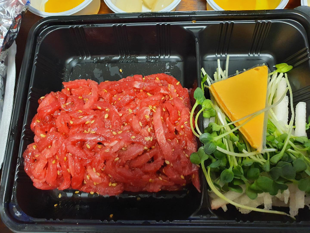 육회덮밥을 먹어보았습니다. 맛있게 한입을 먹는 순간 신맛이 너무 강했습니다. 달달한 육회비빔밥을 생각했는데요. 초고추장의 신맛보다 강해서 처음 먹고 깜짝 놀랐습니다. 뭐가 잘못된건지 조금 살펴 본 다음 다시 먹어보았습니다. 신맛이 계속 나는데 고추장 양념이 조금 잘못된 것 같았습니다. 먹다보니 신맛이 적응이 되었지만 생각한 것만큼 맛은 별로였습니다.