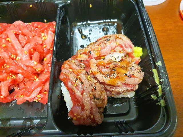 스테이크육회초밥을 먹어보았습니다. 살짝 익힌 스테이크가 조금은 더 쫄깃해졌습니다. 까만 부분은 토치에 구운건지 까만 그을림에서 탄맛이 느껴졌습니다. 불맛이라기보다 탄맛이었습니다. 가스에 그을린 맛이 느껴져서 조금 거북스럽기도 했지만 많이 나지는 않아서 그냥 먹었습니다.