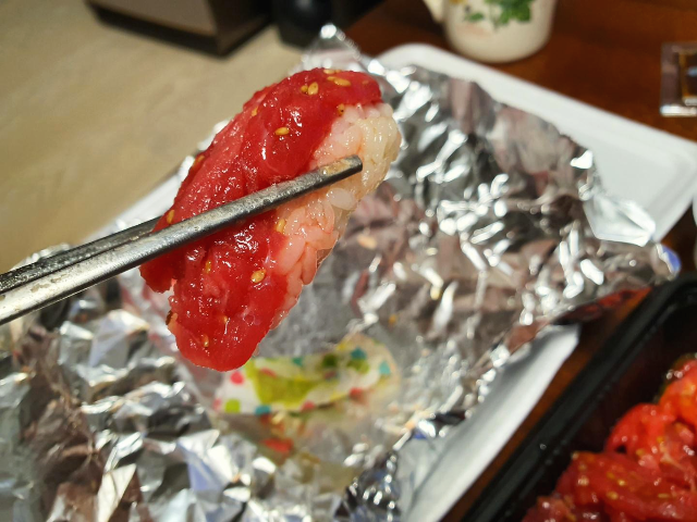 육회초밥입니다. 육회가 밥이 안보일정도로 크게 감싸고 있습니다. 육회초밥의 크기가 딱 먹기 좋은 크기로 한입에 넣었을 때 씹는 식감도 좋고 밥과 육회 모두 양념이 되어 있어서 간이 적당하게 잘 맞았습니다. 육회가 조금 더 쫄깃한 맛이 있었으면 좋았을 텐데요. 밥의 질감과 거의 비슷하게 느껴져서 구분되지 않는 게 조금 아쉬웠습니다.