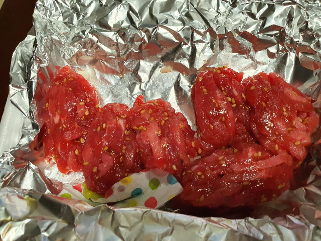 스테이크육회초밥입니다. 육회초밥에서 겉이 살짝 그을린 듯 익혀있었습니다.