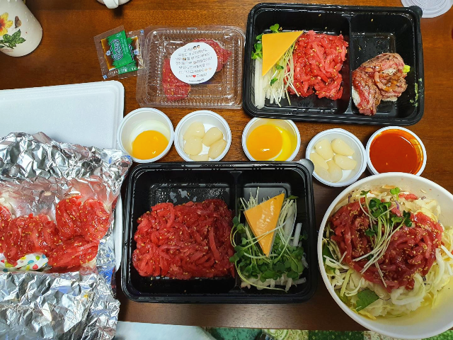 지난번에 육회와 육회초밥만 먹어봐서 이번에는 육회덮밥과 스테이크육회초밥도 주문해보았습니다.