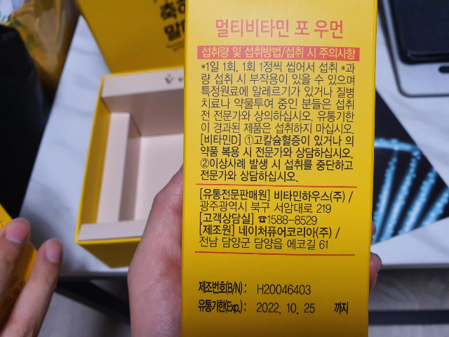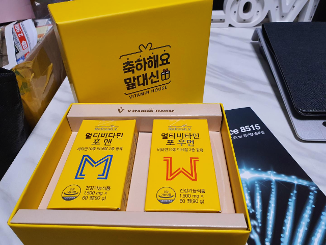 며칠 후 친구의 선물 비타민하우스 멀티비타민을 무사히 잘 받았습니다. 노랑노랑 박스입니다. 멀티비타민 포맨과 포 우먼으로 아내도 함께 먹으라고 세트로 보내주었나 봅니다. 생각이 너무 많은 녀석입니다.