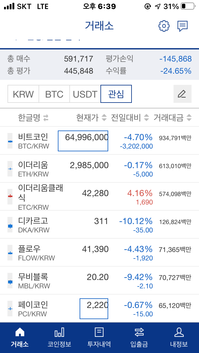 목요일 오후 6시 45분. 오늘도 파란색이 더 많다. 무비블록은 -10% 되고 있다. 소폭 상승 대폭 하락이 이어지면서 평가손익을 갉아먹고 있다. 잡코인들보다 비트코인이 더 걱정이다. 6500선도 붕괴다. 어디까지 더 떨어질지 다시 오를 때 얼마나 더 오르려고 그러는건지..