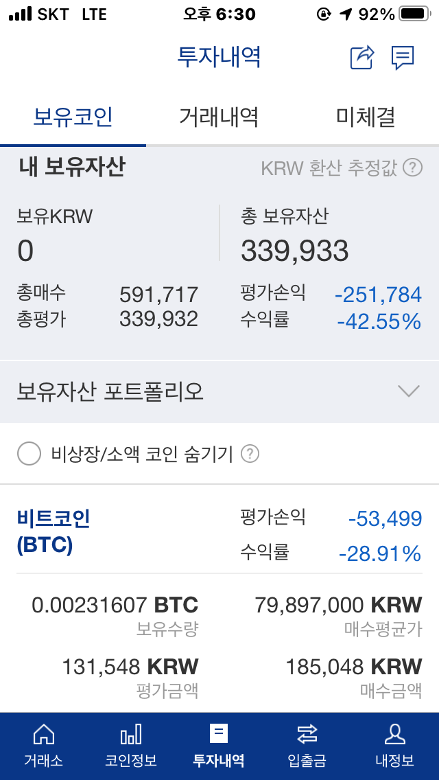 금요일 오후 6시 30분. 멘붕이다. 나는 적은 금액이라서 돈에 대한 큰 충격은 없지만 정신적인 멘탈 충격은 크게 느껴진다. 물타기가 아니라 정말 코인 탈출을 준비해야 할 것 같다. 원금까지 3만원 남았다. 평가손익 25만원인데 수익률이 -42% 반타작이다.