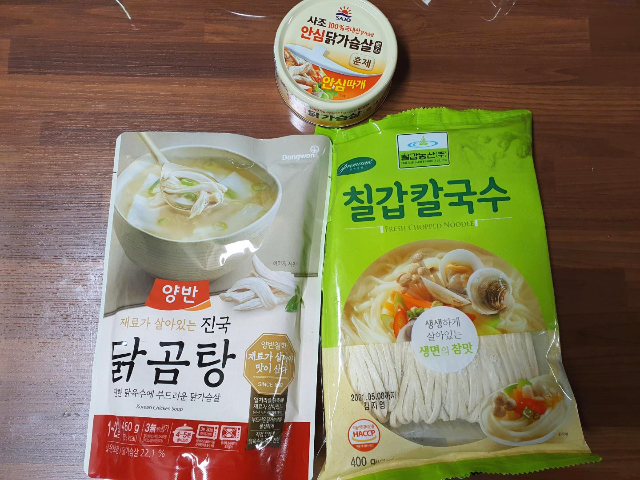 닭칼국수 만들기 준비물입니다. 양반 닭곰탕, 칠갑칼국수, 사조 100% 안심 닭가슴살(훈제)입니다. 초간단하게 만들기 때문에 재료도 정말 간단합니다.