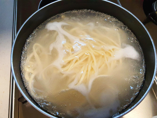 먼저 끓는 물에 칼국수 면을 넣고 5분 정도 삶아줍니다. 칠갑칼국수에는 면이 3등분으로 나뉘어 있는데요. 아내 분께서 조금 얻어먹겠다고해서 2등분을 넣었습니다.