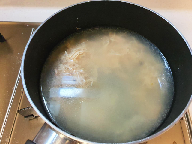 다른 한쪽에는 양반 닭곰탕을 냄비에 붇고 4~5분 정도 끓여줍니다. 생각보다 닭가슴살이 많이 들어있어서 놀랐습니다. 준비했던 사조 안심닭가슴살(훈제)을 안 넣어도 될 것 같았습니다. 그래서 다시 그냥 넣어두었습니다.