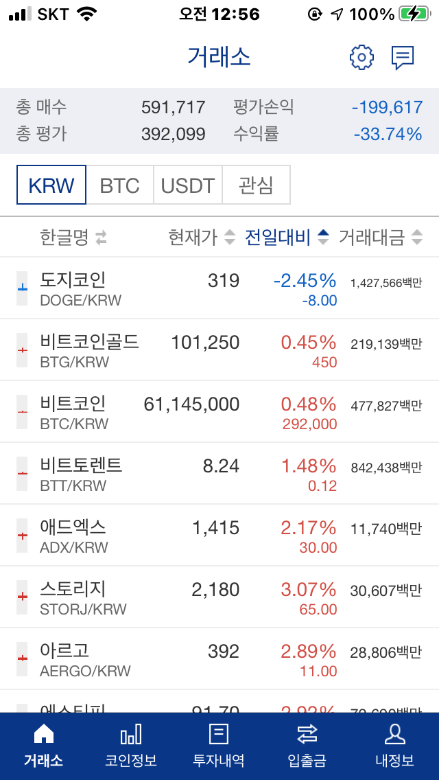 일요일 낮 12시 5분. 이게 얼마만에보는 빨간색들인가. 관심보유 코인들이 소폭 상승세이다. 바닥을 뚫을 기세로 떨어지던 코인들인데 그래도 지금 모두 상향을 가리키고 있다.