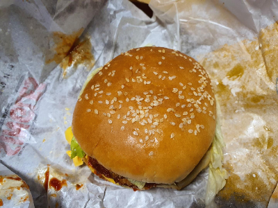 포장지로 햄버거를 구분하기 힘들어서 포장지를 벗겨보았습니다. 사진에서 보듯이 그냥 빵과 아닌 참깨빵으로 구분이 될 수 있습니다. 그냥 빵이 몬스터베이비XL이고 참깨빵이 BBQ몬스터입니다.