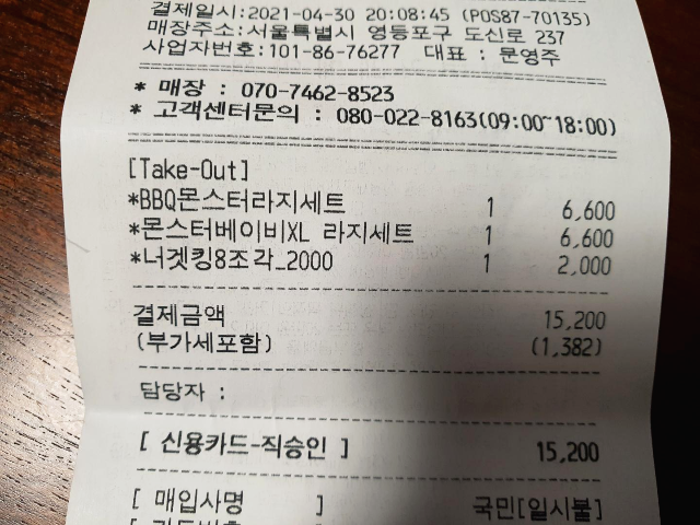 BBQ몬스터라지세트 6600 + 몬스터베이비XL라지세트 6600 + 너겟킹8조각 2000 = 15,200원