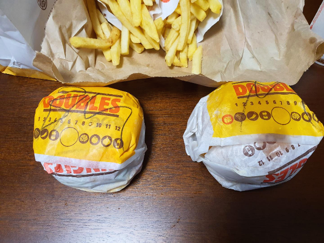 햄버거 포장지는 똑같고 글씨로 뭐라고 써놓았는데 뭐가 어떤 햄버거인지 구분이 안되었습니다. 열어봐야 알 것 같습니다.
