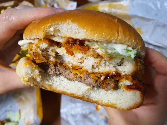 몬스터베이비XL입니다. 순쇠고기패티와 치킨패티로 2장의 패티가 XL로 더욱 두툼해졌다고 합니다. 매콤한 소스가 주르륵 흘러넘칩니다. 입에서 피흘리는 모습 같기도...(그만그만)