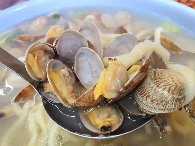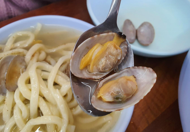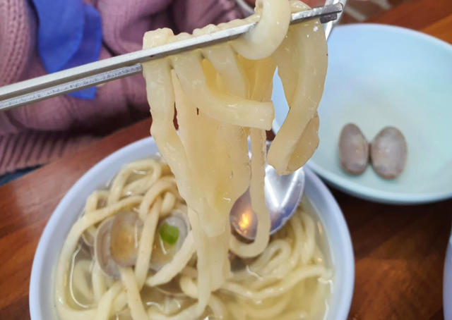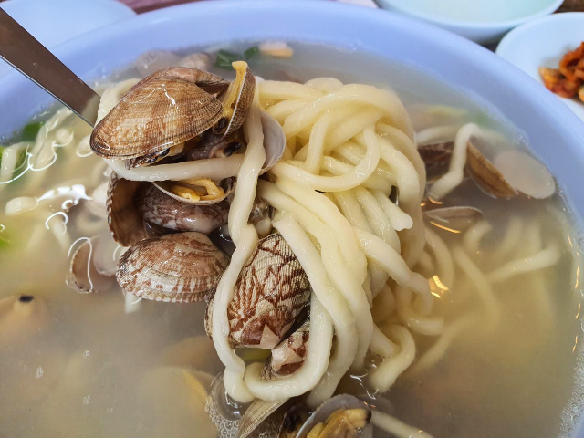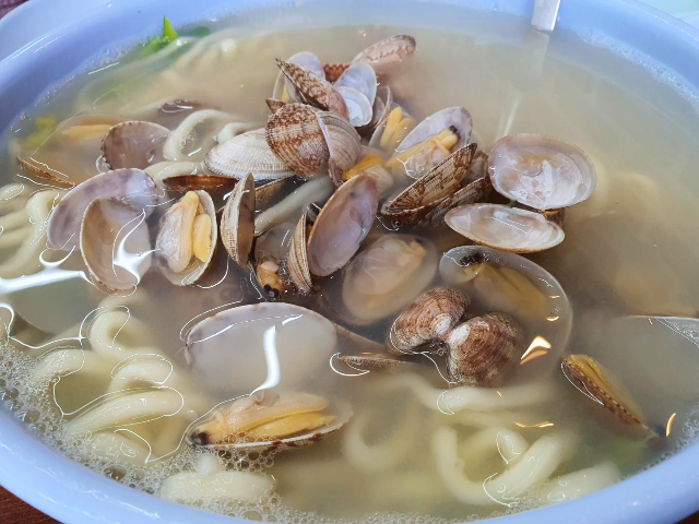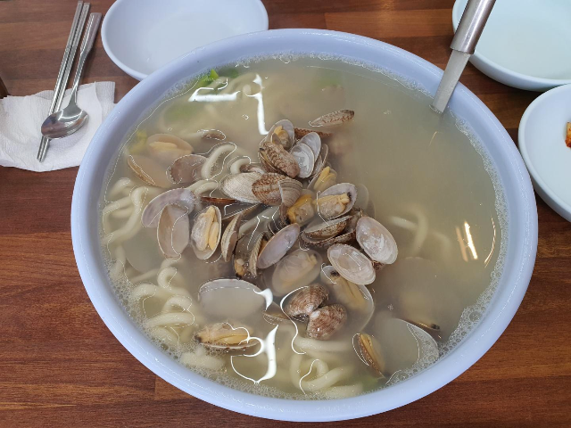 맑고 뽀얀 국물에 국수가 들어있고 그 위로 바지락이 한가득 올려져 있습니다.
