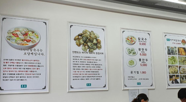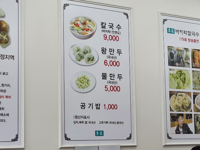 메뉴는 간단하게 칼국수, 왕만두, 물만두, 공기밥이 있습니다. 칼국수의 바지락은 안면도 바지락이고 김치, 배추, 쌀은 국내산. 고추가루는 국내산과 중국산입니다. 칼국수가 9000원이나해서 조금 놀랐습니다. 늦은 오후라서 이따가 저녁도 먹어야하니 적당히 그냥 칼국수 2인분으로 주문하였습니다.