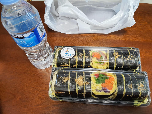 플라스틱 용기에 담겨있는 김밥 옆모습입니다. 내용물에 밥이 없이 계란 위주로 담겨있다보니 힘없이 부서질까봐 단단한 플라스틱 용기에 담겨있는 것 같습니다.