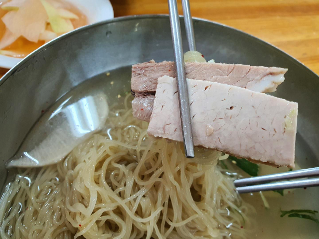 평양냉면 먹어보았습니다. 평양냉면의 육수부터 마셔봅니다. 고소한 육향이 나며 짭짤한 맛이 느껴집니다. 홀짝홀짝 계속 먹게되는 육수입니다.