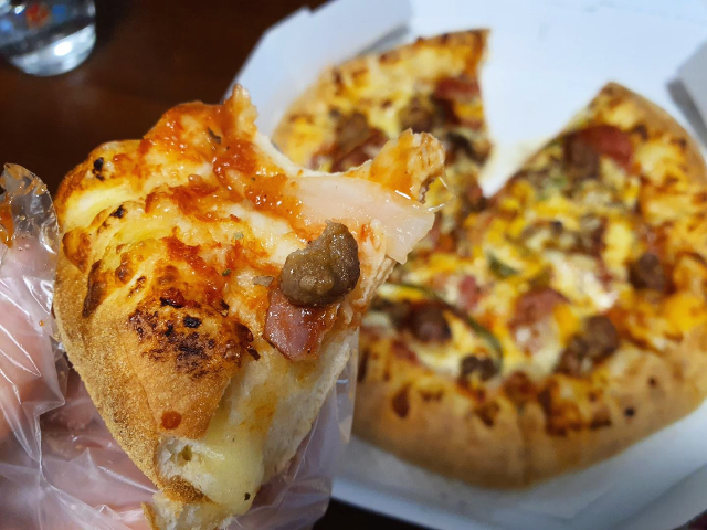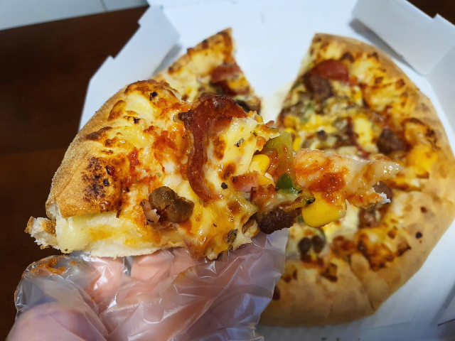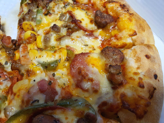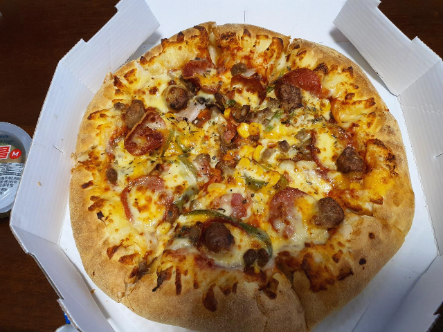 페페로니의 짭짤한 맛과 고소하게 씹히는 옥수수콘과 신선함이 느껴지는 피망이 클래식피자의 느낌을 받았습니다. 콤비네이션피자와 페페로니피자를 섞어놓은 듯한 맛이었습니다. 토핑 모두가 한입에 들어가는 사이즈로 먹기 딱 좋았습니다.