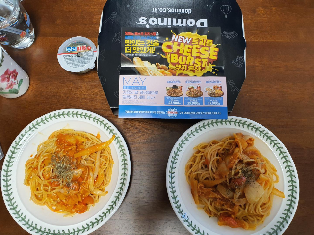 열심히 만들어준 파스타도 같이 먹었습니다. 파스타의 맛도 원래는 진한 편인데 뉴욕오리진피자의 짭조름한 맛이 강해서 파스타가 싱겁게 느껴질 정도의 맛이었습니다.
