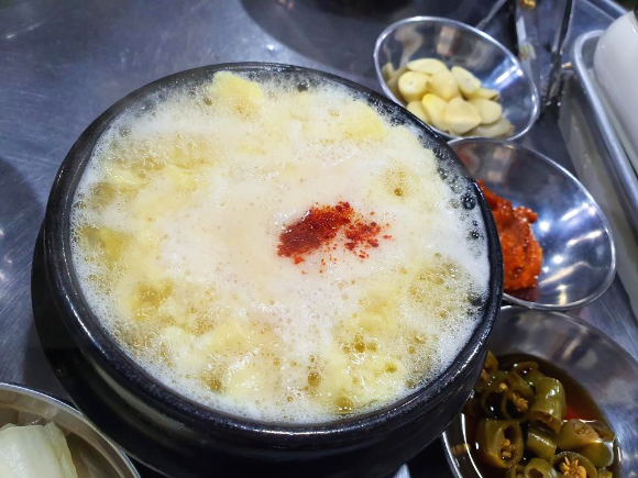 육수는 흔히 먹는 물냉면의 육수 맛이었고 묵은 식감이 부드럽기보다는 조금 단단한 느낌의 묵이었습니다. 처음에는 물냉면 육수 맛 때문에 조금 이상했지만 김치와 김과 묵을 육수와 같이 먹다 보니 새콤하면서 단짠의 맛이 시원한 게 괜찮았습니다.