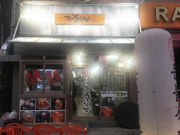 큰 길가 먹자골목에서 안쪽으로 들어오면 쉽게 찾을 수 있습니다. 입구 문에는 음식으로 절대 반칙을 하지 않는다는 문구가 인상적이었습니다.