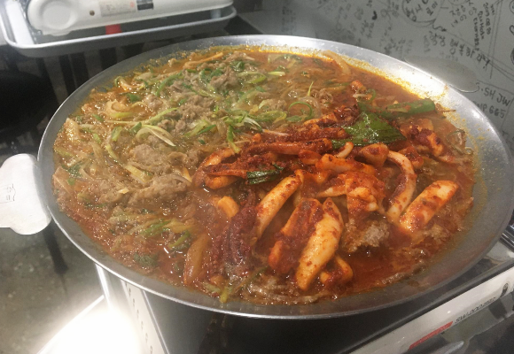 3. 오징어 맛을 극대화시키기 위해서는 빨리 같이 넣어야 했습니다. 오징어는 거의 따로 먹지 않은 채 소육수불고기에 넣어 먹었습니다. 오징어의 빨간 양념이 소불고기 육수에 묻어 나오면서 매콤 달콤한 소불고기가 질리지 않는 맛이 되었고 오징어는 소불고기 육수의 맛이 베어서 오징어의 맛에 달달함이 두 가지의 맛이 잘 이루어진 듯했습니다.