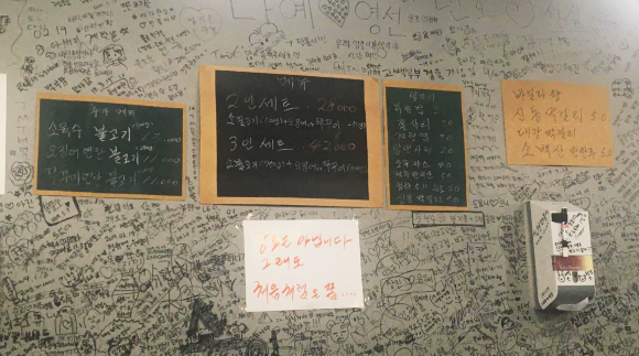 많은 손님들이 다녀가면서 벽에 방명록을 남겨주셨습니다. 멀리서 보면 그 문구들이 꽤나 멋스러워 보입니다. 그 벽에는 메뉴가 눈에 안 띄게 잘 안 보이지만 눈에 힘을 뽝주고 2인세트를 발견. 2인세트(소고기+오징어)와 음료(사이다)를 주문하였습니다. 메뉴는 간단히 소불고기와 오징어, 주꾸미가 있습니다. 기본 소불고기에 오징어나 주꾸미를 택하여 짝을 이뤄 먹는 듯해 보였습니다. 벽에 써있는 처음처럼 소주와 관련된 것은 언급하거나 관여하지 않겠습니다.