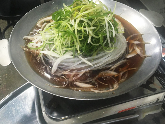 먼저 소육수불고기가 나왔습니다. 고기 위에 당면과 파채를 얹히고 육수를 따로 부어서 나오는 것 같았습니다.