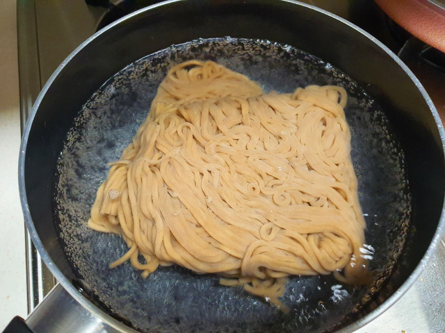 끓는 물에 사리면을 넣고 끓여줍니다. 사리면이 바로는 안풀리기때문에 30초 정도 기다린 후 젓가락으로 살살 저어서 풀어주면 됩니다.