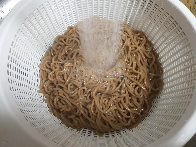 생각보다 짧은 2분30초정도 끓은 후 찬물에 바로 헹궈줍니다.