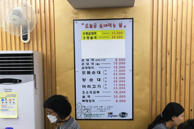 제일어버이순대 메뉴입니다. 저희는 직장동료의 추천으로 순대, 고기가 따로 나오고 순대국이 나오는 순대정식으로 주문하였습니다.