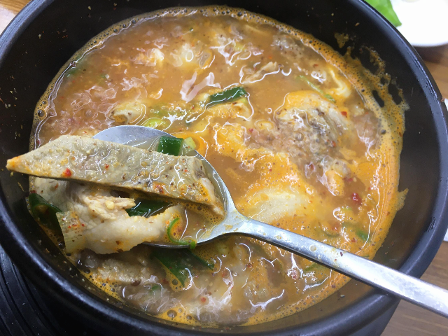 순대국에는 부속고기만 들어있고 순대는 들어있지 않았습니다. 국물은 얼큰해보이지만 간이 전혀 없어서 굉장히 심심한 맛으로 들깨가루와 소금, 새우젓을 첨가해서 간을 맞춰 먹었습니다.